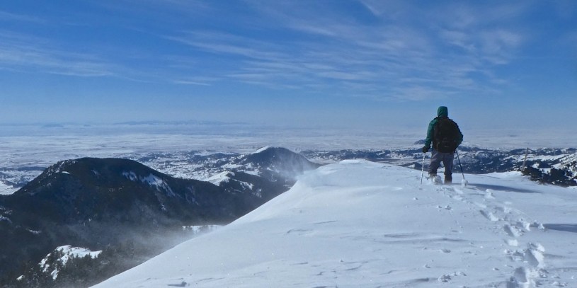 I was unsuccessful in an attempt to snowshoe to the summit of Baldy in the Bears Paw Mountains in February, and I didn’t expect to get another shot this winter. However, due to unusual circumstances, including recent snow, a perfect weather forecast, and COVID-19 school closures, I got that second chance on St. Patrick’s Day (2020). On my failed attempt I turned back when I encountered really deep snow and considerable avalanche risk on the steep west side. So this time I decided to take a longer approach, ascending the more gently-sloped south side . . . and it worked!