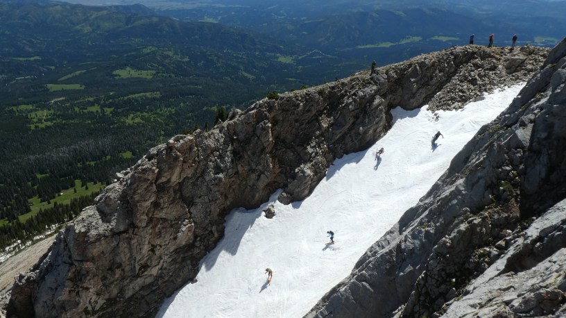 From Pomp we hiked back down to the pass and then followed the trail up to Sacajawea. Not far below the summit we encountered the goats, who are fairly accustomed to having plenty of two-legged visitors. As we were watching them, we chatted with a fellow who had packed his skis up – We’d seen several others who were doing the same. He told us they climbed up in order to ski down a couloir by Naya Nuki known to local back-country skiers as “The Great One”. Mark and I decided this was something we needed to see, so after spending several minutes on the top of Sac, we followed the half-mile of ridge trail to the summit of Naya Nuki to watch. Our time on Naya Nuki was the best part of the day. The wind had died down a bit, there were plenty of goats around, and we found the perfect vantage point to watch the skiers. There are several photos of the goats and the skiers in the photo tour (see link below), including one of six skiers shooting down the couloir! – possibly the most unusual spectacle I’ve ever witnessed from a mountain-top.