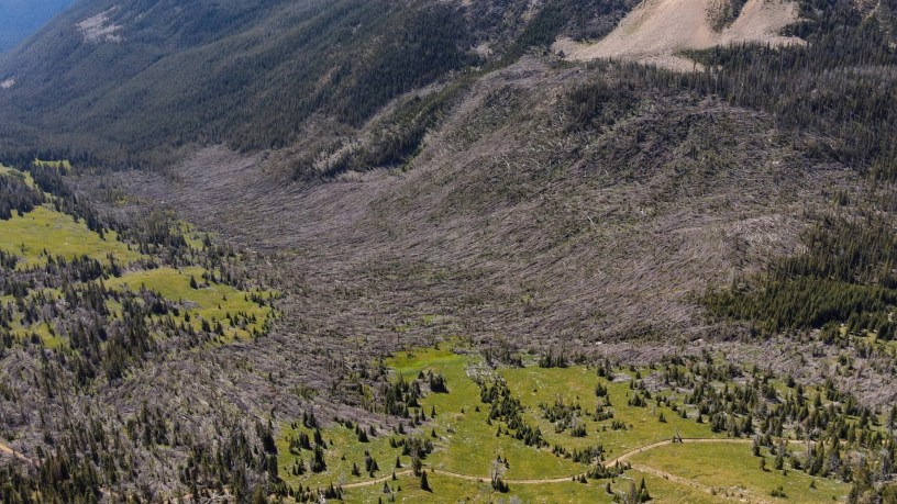 On the afternoon of Sunday, August 11th 2019, a microburst occurred in the Tobacco Root Mountains of southwestern Montana, blowing down the estimated 200 to 250 acres of trees shown in the photo above. This blowdown resulted in the blockage of trails leading back to Granite Lake, stranding 4 people in the backcountry due to trees blocking trails leaving the area. Personnel from the Madison County Search and Rescue and a National Forest Service fire team were sent in to rescue those who were stranded, and two military helicopters were dispatched to see if anyone else was in the area.
