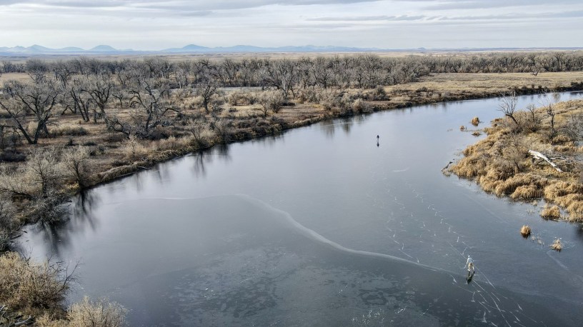 My young friend Alex (teaches fifth grade) joined me for the Friday morning skate on Dead River. It seems like whenever I invite this young man to go along, the weather is perfect. This day was no exception, and the ice was perfect as well (3-4 inches thick, like glass) . We skated back and forth on the 1.7 mile track of the oxbow lake for about almost two hours, thoroughly enjoying ourselves! Unfortunately, conditions like this seldom last – Fluctuating temperatures (typical of Hi-Line winters) often ruin the ice, wind storms cover it with a film of silt, or snow covers the surface. To see what two hours of skating on pristine wild ice looks like, check out the photo tour, which includes several taken with my drone. If you’d like to know more about oxbow lakes, continue reading.